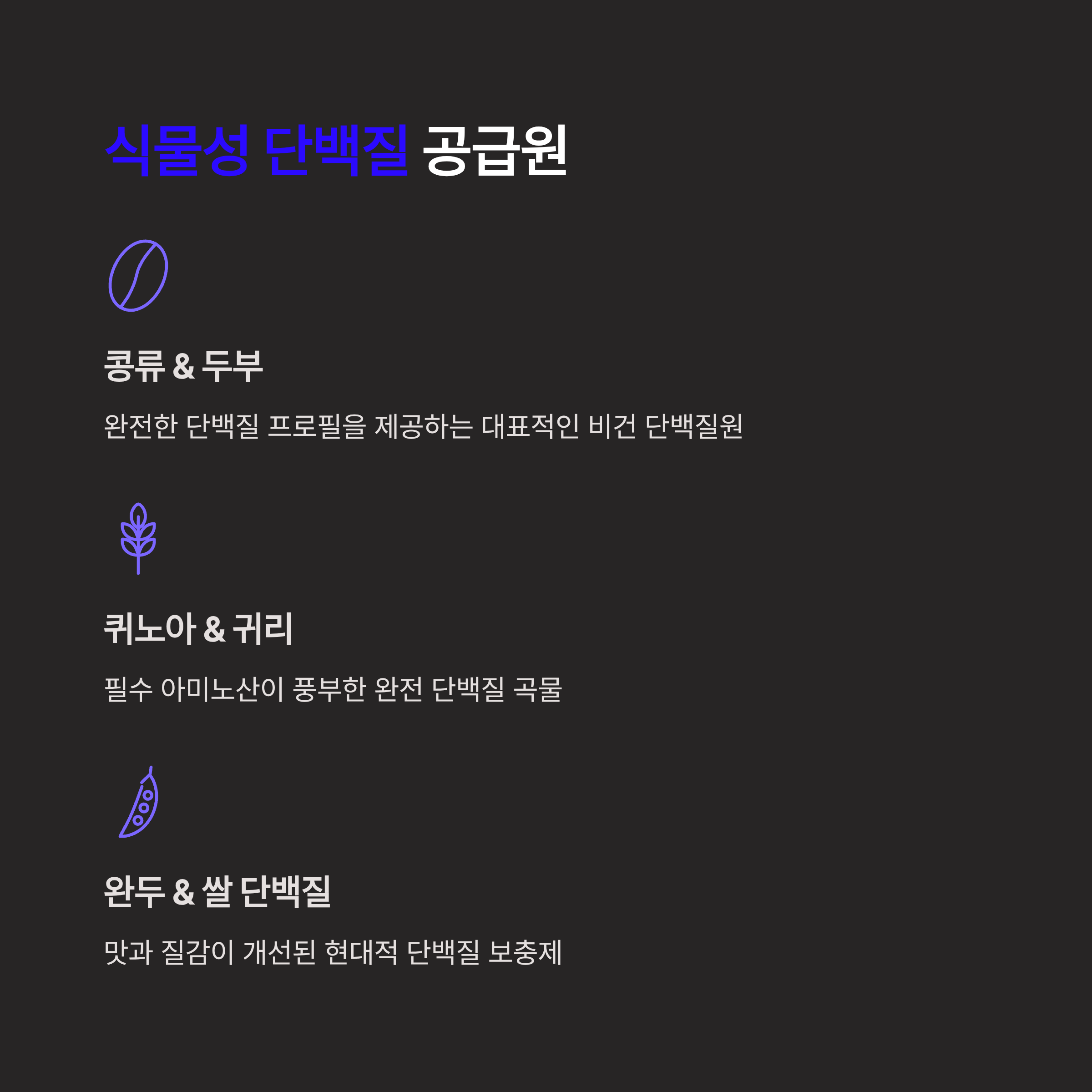 단백질 섭취는 비건 식단에서 중요한 과제 중 하나입니다. 근육 유지와 회복을 위해 하루 권장량을 충분히 섭취해야 합니다. 콩류, 두부, 렌틸콩, 병아리콩, 퀴노아, 귀리 등은 훌륭한 식물성 단백질 공급원입니다. 운동을 병행하는 경우 완두 단백질이나 쌀 단백질을 원료로 한 단백질 보충제를 이용하면 효과적입니다. 최근에는 맛과 질감을 개선한 제품이 많아져 비건뿐 아니라 일반 소비자들에게도 인기가 높습니다.