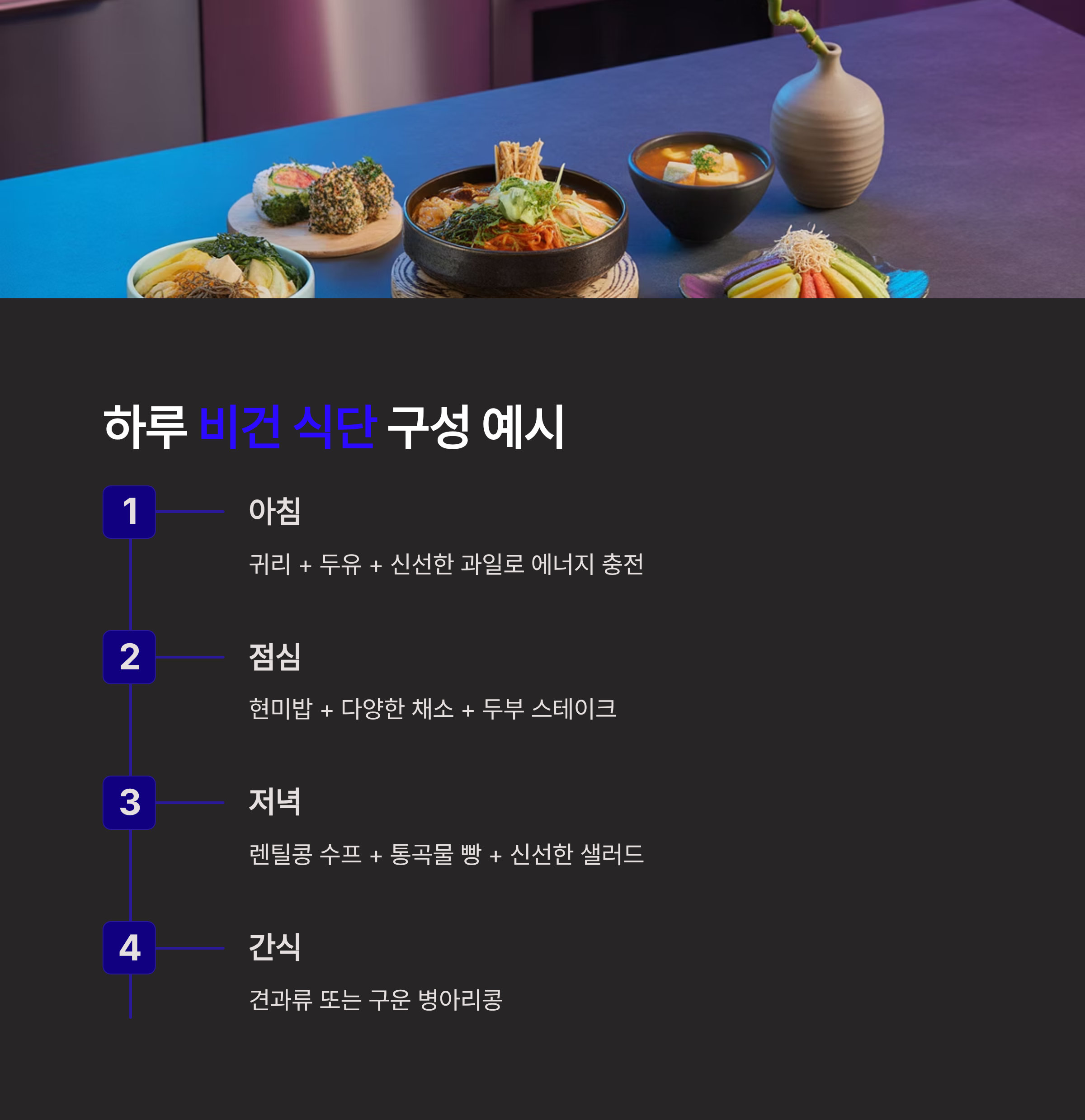 하루 식단을 구성할 때는 아침, 점심, 저녁 모두 균형 잡힌 영양소를 포함하는 것이 중요합니다. 아침에는 귀리와 두유, 과일을 곁들여 에너지를 공급하고 점심에는 현미밥과 채소, 두부 스테이크를 함께 먹는 것이 좋습니다. 저녁에는 렌틸콩 수프와 통곡물 빵, 샐러드를 곁들이면 영양 균형을 유지할 수 있습니다. 간식으로는 견과류나 구운 병아리콩을 추천합니다.