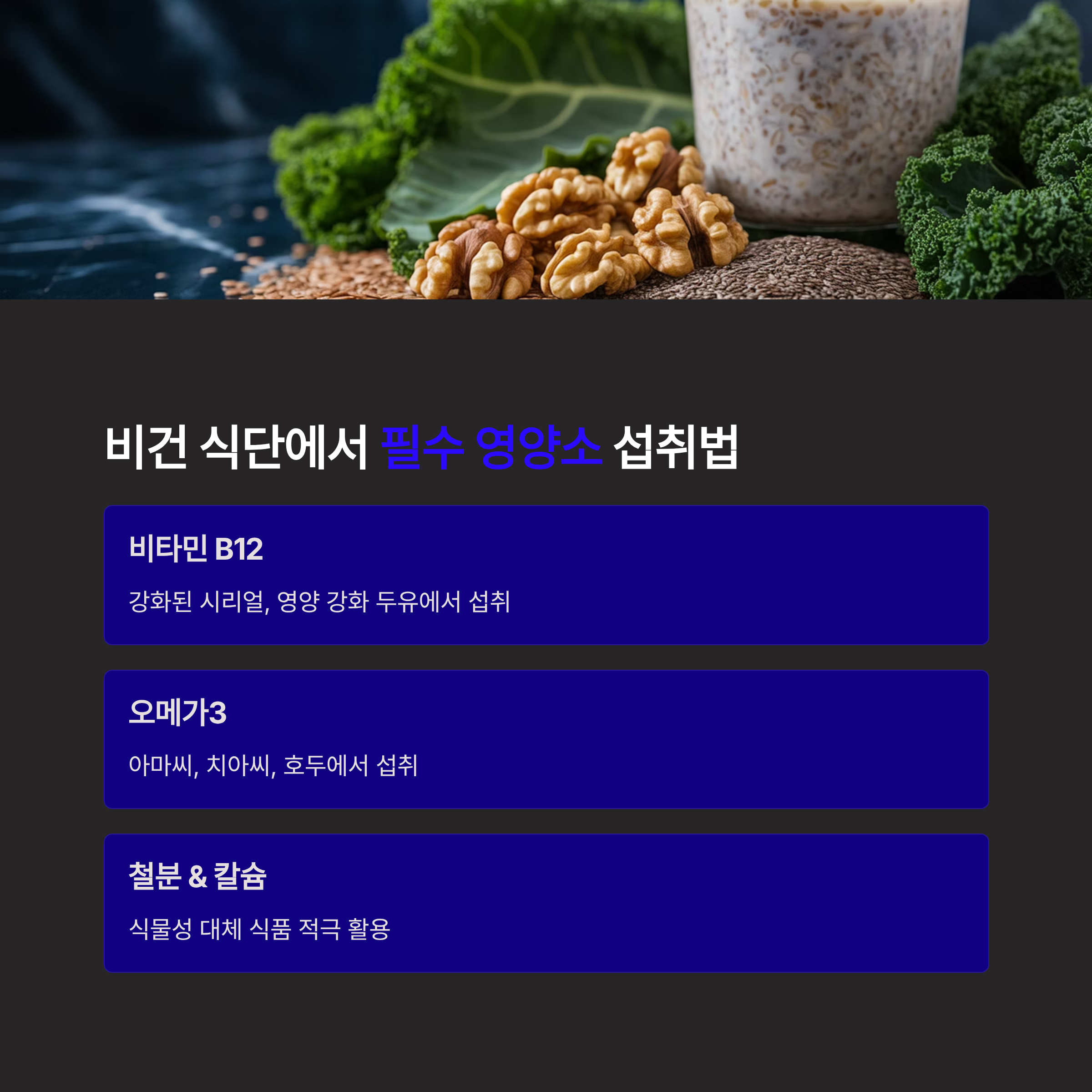 하지만 동물성 식품에서 쉽게 얻을 수 있는 일부 영양소는 비건 식단에서 부족할 수 있습니다. 대표적으로 비타민 B12, 칼슘, 철분, 오메가3 지방산 등이 있습니다. 이를 보충하기 위해 강화 식품이나 영양제를 활용하는 것이 좋습니다. 예를 들어 비타민 B12는 강화 시리얼이나 영양 강화 두유에서 섭취할 수 있고, 칼슘은 케일이나 아몬드 우유, 오메가3 지방산은 아마씨와 호두에서 얻을 수 있습니다.