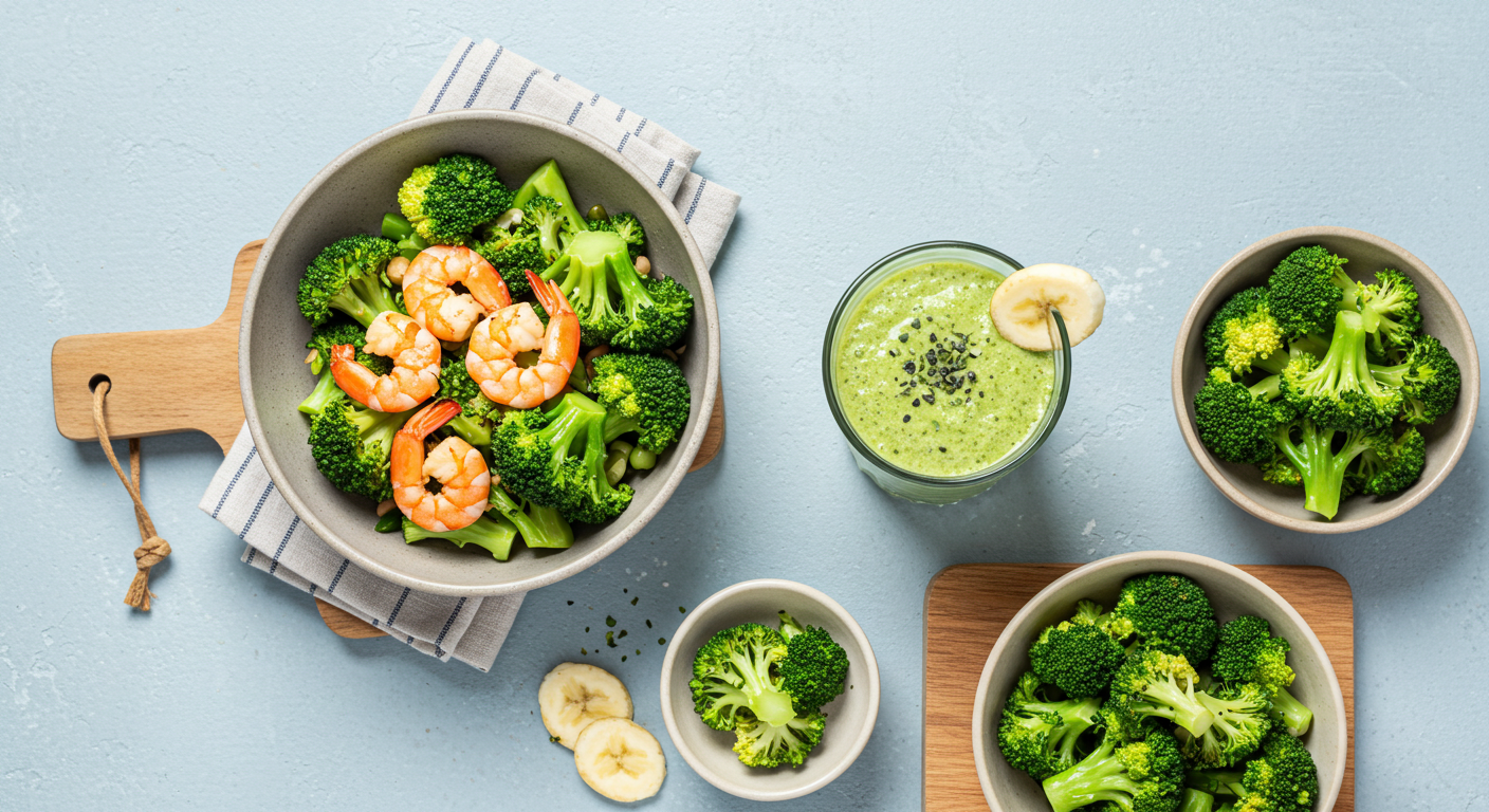 - 재료: 데친 브로콜리 50g, 두부 1/4모 (약 50g), 바나나 1/2개, 무가당 아몬드 우유 150ml, 치아씨드 1작은술 (선택).